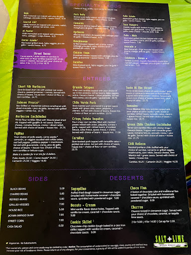 Salt and Lime was the best Mexican food Ive ever had besides the tacos and burritos I had in Mexico. Their street tacos were very carefully seasoned, and very flavorful. I ate 2 street tacos in 4 bites, and the juice just oozed out of the tacos. I want to go to Salt and Lime again!