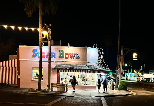 My husband and I are longtime Scottsdale residents. We recently went to the Sugar Bowl for a couple of sundaes. Although the sundaes were good if you like plain old vanilla ice cream as the basis for all varieties, I was not happy with the cleanliness of the shoppe. The place was crowded with people from all over the world. The floor was visibly dirty. We sat at the counter and the seats definitely need replacing and were sticky. I was most appalled as I waited for my husband to pay the bill and got a good look at the front doors. FILTHY. They definitely need a good professional cleaning. I didnt want to touch them at all. Horrible! With all the great places in Scottsdale there is no excuse for this. You guys may be a landmark, but we will not go back.