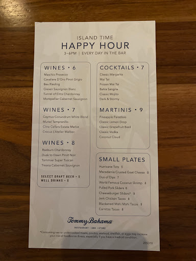 Great experience at Tommy Bahamas. We went for Valentines Day, we arrived about 10 minutes early for our reservations but we were seated right away. Started off with mojitos, were excellent. Crab cake appetizers followed, also excellent. We both had the land and sea off the special Valentines Day menu, began with a very good crab bisque, both the filet mingon and lobster tail were perfectly cooked. We finished with a toasted coconut and pineapple cake, just the right amount of sweetness. The wait staff was polite and attentive, and the atmosphere was great as well, we enjoyed our evening.
