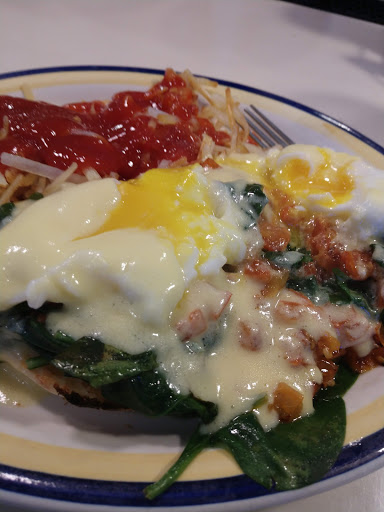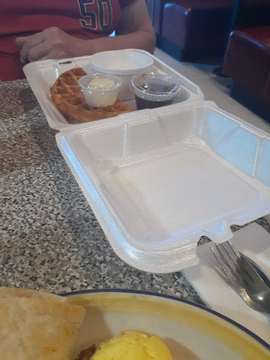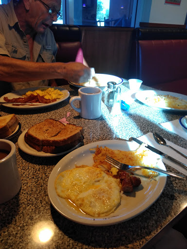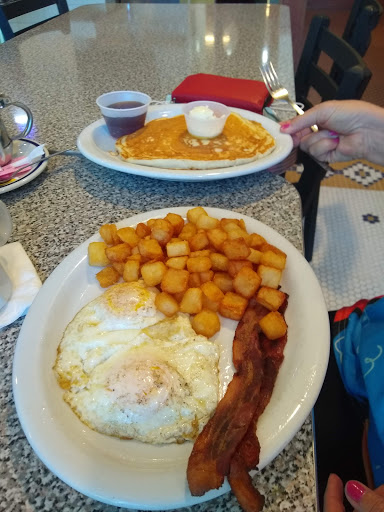 First sat down the AC was obviously not working it was a really hot inside then we ordered our food my wifes a game came eggs were slimy they were supposed to be over medium the bacon was perfect I ordered the same thing my bacon was burnt to a crisp send it back then I start to eat my hashbrowns which are burnt to a crisp and so Chewy you couldnt even cut with a fork the lady returns with new bacon even worse than the last when you touch it it just crumbled each time I told the lady she just offered to get more and it never got better needless to say I didnt eat any of it and they still charged and never offered to take it off also if your a veteran they dont offer a discount I wont eat here again very disappointed and still hungry
