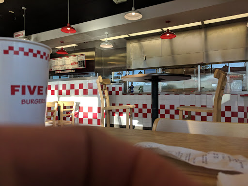 This was my first Five Guys experience and I left a happy camper. I have one of these near my house but Ive never been there. My son and I were on a road trip and we needed a late night meal. Thank goodness this Five Guys was open late. The young man behind the counter was very helpful and even suggested smaller less expensive sizes because the servings are large. They dump all the extra fries from the basket into your bag so it was a LOT of food for two people. The drink machines were really nice. There were so many choices. Ive seen them before but this was the first time I used one and I really liked making a custom drink. My son and I enjoy restaurants with free peanuts. The prices are a bit high but you leave very full and you can get your burger and drinks just how you want them. The music is a bit loud and the interior echoes so it is very difficult to talk to the person next to you without shouting. It is what it is, fun fast food and not a quiet sit down place.