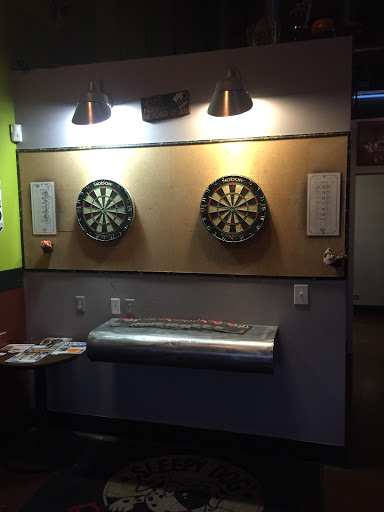 Good location with darts, board games, and some space inside. Food trucks and pizza delivery are on the menu. All Sleepy Dog brews are on tap and they have some interesting beer "mixes" to sample. Swag and TVs are everywhere and the device could use some work. Try the sampler and popcorn and move on to the next place:)