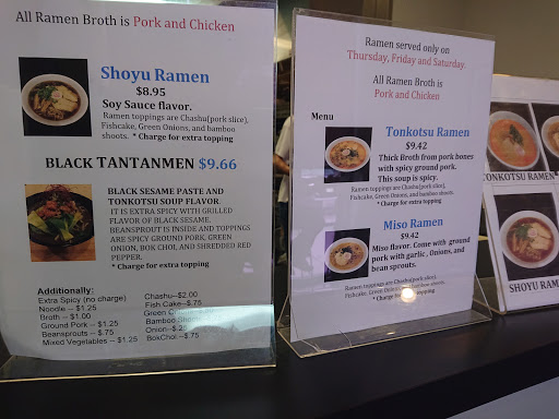 As much as I looked forward to eating here and trying their ramen (I eat ramen everywhere I go) I was sadly not impressed. Dont get me wrong, the broth was delicious in the tonkotsu ramen, however the bowl seemed a little empty for the price of ramen. The ramen here did not include an egg and consisted of: 1 fish cake, a few bamboo stalks, 2-3 very thin (deli style) slices of pork. The noodles were also nothing special, there were a fair amount of them, but they seemed a bit over cooked. I also tried their sushi and ordered a spicy tuna roll which was not spicy in the least and virtually flavorless. Every last bit of the roll lacked in flavor even with the sesame seeds surrounding the rice. I will be returning to try other menu items, but if you are looking for phenomenal ramen, try Obon in the downtown area.