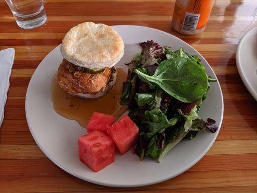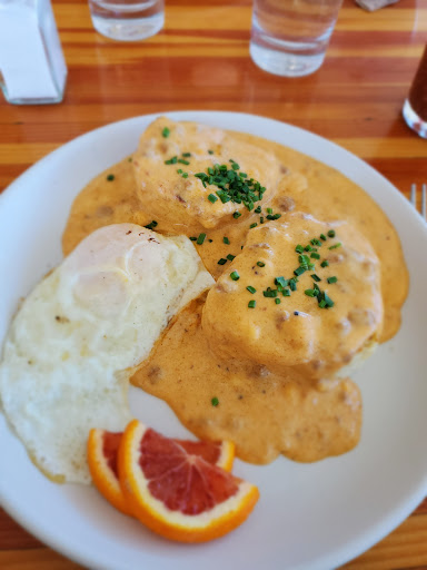 This place immediately reminded me The Grill that used to be on Congress, downtown. Anyway, I loved that they kept the old Chaffins exterior and made subtle changes to the interior. To begin, the exterior is nicely landscaped and they even have an L-shaped wood bench, under the palm tree near the front door. Upon walking in you see sky blue booths and bar stools, unique candles and an alcoholic bar (see pics for details). The walls are white with a few simple framed pictures including the 2 hilariously odd ones outside of the restrooms. You can see the kitchen that its situated behind the bar seating. The service: Our service was great. There were 2 people that waited on a row of booths & from my observations there was never anyone waiting. The food: Their menu is unique in that it offers breakfast and lunch, non-alcoholic, alcoholic (beer, wine and liquor/cocktails). I describe the food as slightly Cajun inspired. My dad & I ordered a Welcome Breakfast (2 eggs, hashbrowns & a delucious homemade biscuit). I added two thick pieces of bacon and my dad added andouille. Andouille is a cajun inspired smoked sausage with a slight kick to it but nothing too overpowering. Needless to say, our meals were great. Water was serviced in a mason jar & was ice cold. Parking: It is located just East of downtown of Broadway, off of Euclid. It has am ample free parking lot with spots in the shade.