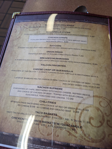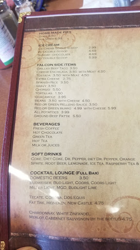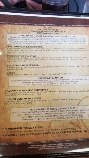 Back in the 1970s I used to make business trips to Winslow. Back then the Falcon was widely known to be the best eatery in town. My wife and I were staying in our RV at a State Park just out of town and decided to go to Winslow to do some shopping. On a fluke, we decided to give the Falcon Restaurant a try. We found the stop to be a very pleasant experience. The waitress was a young girl without a lot of experience but very competent with a nice genuine personality. She recommended the chicken fried steak special and we both complied. The steak was good with a liberal helping of white gravy but I really liked the chunky consistency of the mashed potatoes which had a nice home made quality, unlike the whipped potatoes most restaurants serve. As we were finishing, the owner came over to ask how we liked the meal. He seemed to genuinely appreciate our patronage. When I told him I used to eat here 40 years ago he gave us some interesting information on the original owners. We dont usually eat desert but when he started to describe how the homemade pies were made right there in their kitchen we couldnt resist. We shared a piece of tasty coconut cream with a flaky crust which was easily distinguishable from factory made. If you want a good meal with great service in a nostalgic atmosphere with reasonable pricing, I would certainly recommend a stop at the Falcon. You cant beat the value.