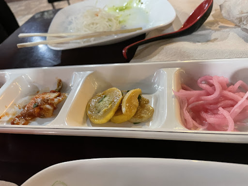 Pricey so my friend and I were going to split a plate of bul-go-gi one afternoon. And we drew looks that to be kind might be seen as displeased. They only brought kim-chi and the the majority of the customary garnishes after having to directly ask. The music in the restaurant was rap/hip-hop which didnt quite suit the decor. And of course I we had to shout into the kitchen to even find someone so we could get a refill. The dish was solid and the place looked decent, so 2*s
