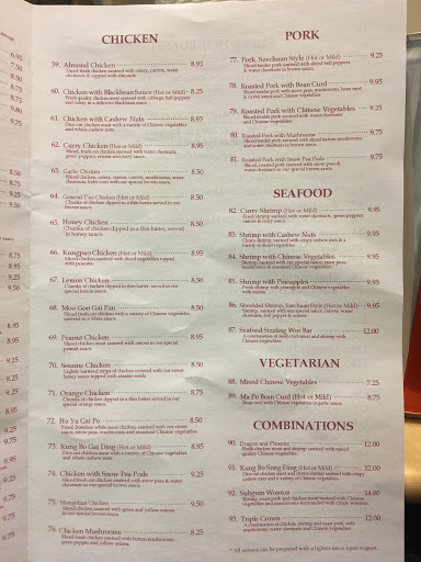 The worst thing I put into my mouth coming out of a Chinese restaurant I wouldnt or couldnt recommend this to any one on the planet the cooks arent Chinese decedent people the chicken tasted like cardboard and freezer so did the steak I left my plate full of food I cant eat will NEVER RETURN for bad food HONG KONG CHINESE IS 10000% BETTER and LEGIT CHINESE to the fullest