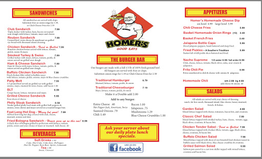 Hahaha I love reading the comments about the food. Ive eaten at Homers a thousand times and its not for the food. No one goes to homers for the food. Now the waitresses...... thats another story. I do recommend the chocolate fried pie!