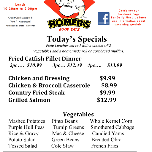 I worked across the street from Homers! Definitely some of the best food Ive ever put in my mouth! Quick service.. friendly staff n atmosphere.. great prices w/plenty of food for your buck.. if you love that southern down home country taste, try Homers on Roosevelt Rd.. definitely make you lone for home..