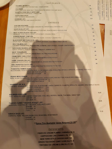 We ate at Kemuri for an anniversary dinner. It was our first time there and we learned what we were missing. Enjoyed the restaurant very much. the service was excellent, as was the food. We both started with the Miso Soup, very tasty. Our entrees were, for my wife the Wasabi Tuna Poke Rice Bowl and I had the Bibimbap with roasted pork belly. She loved the dish and would order it again. My entree was a lot of food and was so good that I finished it off. We both had a glass of wine. The tab, counting tax and tip, was $80, very reasonable, considering the quality.