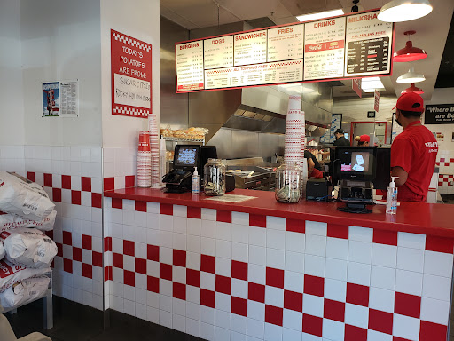 I love 5 Guys. :) They are the only burger joint (that I know of) apart from In-n-Out Burger that has the choice of a lettuce wrap instead of a regular hamburger bun. Kudos to that! Ill keep coming back for your lettuce wrapped bacon burger. :) The lines are usually not long and the staff is very efficient, friendly and attentive (theres constantly someone who takes the trash or sweeps the floor). The place is big enough and has outdoor seating as well. The only thing that I dont like is the waiting time. I know they make everything fresh and on spot (patties) and that it takes time, but when youre hungry its still a heck of a wait. You do have tons of peanuts to eat in the meanwhile, if youre a fan/not allergic.