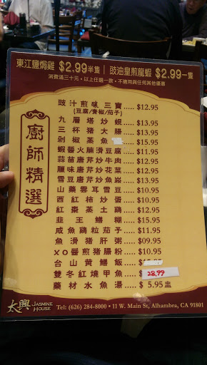 One good thing about serving jury duty at the Alhambra courthouse, is having all the food options on Main. Jasmine House is a sit down restaurant with a to go in the back. I dined here on 3 occasions, once in the restaurant & twice to go. Restaurant The restaurant has various lunch specials, starting from $6.99. After a quick glance, I decided upon the beef w/ bittermelon. It came with choice of soup (egg flower or sweet & sour) & choice of rice (white or brown). The beef w/ bittermelon was a good sized entrée. The slices of beef were tender, with just a hint of sweetness. The bittermelon was bitter, which does all kinds of wonders in regards to health, especially blood sugar. The sweet & sour soup was satisfactory and the rice was fluffy. To go 2 item combos w/ soup are at the bargain basement price of $3.68 plus tax. Unfortunately, most of the items warming in the hot trays are nothing to write home about. I tried to find the best of what was to be had & went with braised eggplant & fried whole shrimp. Plenty of eggplant was to be had, but combos are limited to only 4 shrimp per order. On the second occasion, I asked for more since there were only 2 shrimp left in the hot tray. The lady gave me an extra one, but was firm in not giving me that last one. Go figure! The eggplant slices were soft, with a salty sweet sauce. The shrimp had a light breading on them, and were satisfactory. The soup was watered down, but for $3.68 plus tax, a filling meal was to be had, if not extraordinarily so. Service was okay. One complaint though, I asked for water at the to go & the lady tried to sell me a drink. I insisted on a cup of water, but she wasnt relaxing on the drink solicitation. I then went to the restaurant, asking for water, which a waitress replied "sorry". Unperturbed, I asked another waitress and she graciously gave me a Styrofoam cup of H20. Im a customer, I should get a cup of water if I ask for one. Plenty of seating, with booths & lazy Susan tables inside the restaurant. I sat at the al fresco tables overlooking Main all three times I visited Jasmine House. Parking is at the public parking structure to the rear of Jasmine House on 1st. Jasmine House serves its purpose, nothing more. Lunch specials inside the restaurant & cheap combo plates in the to go section provide meals quick & inexpensively. I was satisfied with the food I had, and excluding the hiccup about the water, was content with the service. Jasmine House does in a pinch when youre looking for cheap eats on Main. Recommend! NOMNOMNOMNOMNOMNOMNOMNOM