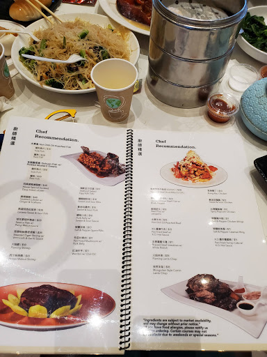 They dont have DIm Sum carts rolling around here. Nope, you have a menu which you check off what you want. This kinda kills the fun for me because I love to look at the food before I order. Recommended Food: -------------------------------------------- Har Gow (Shrimp dumplings): 5 stars Much, much bigger than other places. Very fresh, came to the table steaming & tasty. BBQ Pork Bun: 4 stars 1 of the better things her eon the menu. Tasty & yummy, not mushy like other dim sum restaurants. Spinach & Shrimp Dumpling: 4 stars Explosion of shrimp, spinach, water chestnuts all wrapped up in a dumpling with ma-sago eggs sprinkled on top. yummy =) Portuguese Egg Tarts: 4.5 stars Crust was very light & flaky (my fave type) & middle was sweet & eggy. so yummy. This is a must try if you love egg tarts =) A-OK / Not recommended Food: ----------------------------------------------- Crispy shrimp wrap: 2.5 Stars (just ok) Crispy & flaky fried noodle casings with very small bits of shrimp on the inside. Bot of a let down Id say. =( Mushrooms w/ Tofu: 2.5 stars On the salty side but mushrooms & black fungus added a good flavor & texture to the tofu. Chicken Feet: 2 Stars Very bland, had no flavor at all. Very disappointed. =( Pork ribs: 1 star (do NOT order) Very bland , had no flavor at all & had no sauce on top like other Dim Sum restaurants do. ----------------------------------------------- Overall: Food: C Most of the foods were very bland & had no taste at all. This is definitely OVER priced for bland food. =( Service: D Very very slow, had to keep waving them over to ask for things. And when we did ask for things, theyd forget to bring us it & wed have to ask for it again. Ugh, whats up with all these waiters & they cant even get a request correct? Took us forever to get a table too. Decor: B+ This is probably why this place is packed because its trying to look nicer & fancier than all of the other 1000 dim sum places in SGV. This doesnt make up for the lackluster overpriced food thats being served here. Womens bathrooms here are gross, it seems like they never take out the trash / clean the bathrooms here. Eww.. =( *TIP: You can RSVP over the phone, BUT you have to do it 1 day ahead. wth??! Parking: They have their own parking structure & theres also parking around the restaurant.