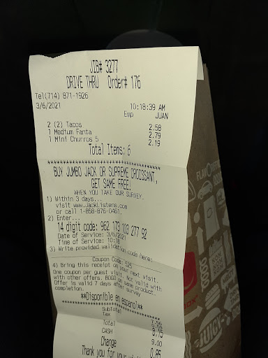 Its jack in the box nothing really to much to say. other than check you food amd re check. because during the 3 days we stayed at dineyland this was the only restaurant close to our hotel and they gave us the wrong order the three times. i told them and they fixed it but the first time we had left when we figured it out. so check your food. but if you go get the ultimate becan xheese burger and the stuffed jalapeños.