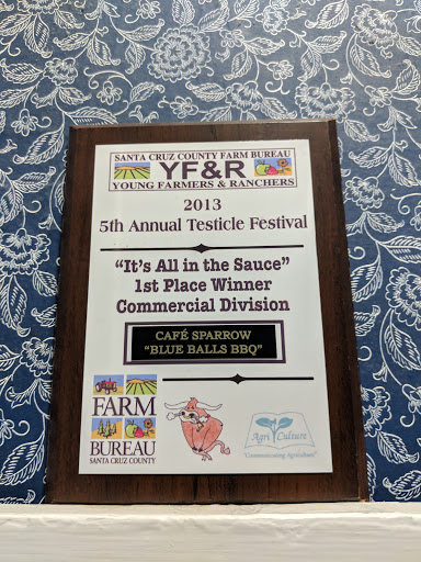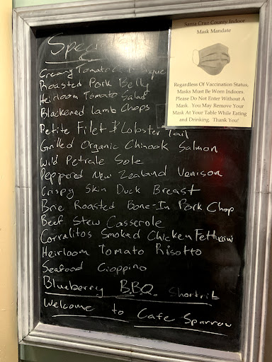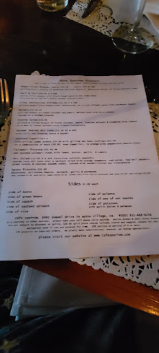 We stopped in Cafe Sparrow on a weekday afternoon after my wife found it on the net while driving from San Diego to San Francisco. It turned out to be a fantastic experience. Starting with the wine, then I have to mention the great service and last to mention but not least was the food. Oh, the atmosphere, and the friendly feeling given off by other diners was great too. I cannot imagine anyone being disappointed in anything at Cafe Sparrow. We would be regulars if we didnt live in Hollywood, Florida.