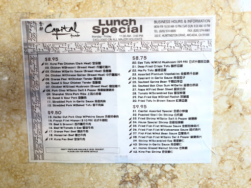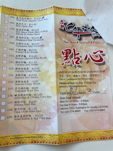 My family has eaten at the Capital Seafood in Monterey Park, so finding one closer to us in Arcadia was great. We ate there a few times for their makeshift dim-sum (no carts, just sushi-style paper slips) and had dinner a few times as well before we booked the place for my grandmas 80th birthday. Great, great service; authentic food with enough newbie-friendly dishes to not keep the uninitiated starving; and typical clean dim sum decor. In terms of dishes, youll be wanting pretty much everything they have for dim sum, and for dessert youll want the almond tea. It may sound weird, but you want it.