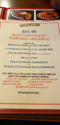 I have been going to Chris & Pitts for over 20 years. When the one in Anaheim closed down, I missed it terribly. Good thing there is a few others open in Bellflower, Downey, and Whittier. The Bellflower one is the closest to me and after not having Chris & Pitts for a couple years, it was like reliving my childhood. The food has not changed, still excellent. If you want great food, big portions, and low prices. You cant do better than Chris & Pitts.