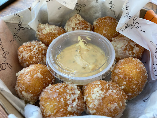 Oh how I love cute packaging. This place packs all your meals up in a little hexagonal box for you to take and eat (there are 2-3 tables outside if you want to enjoy it there though. HINT: call in your order. This is a take out place and we ordered to eat there, but it seemed like everyone who actually called in and got take out got their meals first. It was a long wait, but it was worth it in the end. We got the grilled beef hangar steak which was pretty good. The flavor was good, but the steak wasnt super tender and was a little chewy. We also go the chicken poptart which was really good. Im usually not a big fan of ordering chicken because its so easy to make, but when someone stuffs some with great flavor in a pastry puff, im sold! And then we also got the crispy potato puffs loaded up - parm, garlic and parsley and truffle essence. Do yourself a favor and get these. All the meals comes with potatoes as well which were really good. Overall, each of the boxes were really good and my only complaint (aside from the wait) is that everything is pretty greasy. But give this place a try!