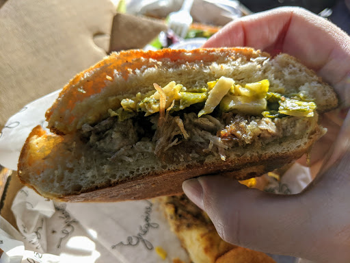 Did I miss the memo? I dont see the hype =( we ordered the potato puffs, grilled chicken pesto wrap, and braised lamb sandwich. As others have mentioned, suppeeerrr small place. Mainly meant for take out. Luckily we were able to score a table outside to eat. It took a bit to get our food, but mainly because they had a lot of take out orders ahead of us. I found the potato puffs to be fine, but a bit bland. Even the dipping sauce. The wrap was ok. I didnt try the lamb sandwich but my friend said it was fine. Maybe we ordered the wrong things? I think the price is a bit steep for what you get though. If Im paying $10 for a sandwich, I want an epic sandwich. Not just a ehh one. Service was friendly.