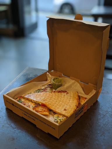Sliver is great, perfectly located for lunch and the pizza is just great. There isnt a pizza here that is bad and actually I had the salad catered once and it was also really great. They are quick and friendly, their slice to slice variation has gotten a lot more consistent (almost approaching the consistency slice to slice at cheeseboard), and I really just have no complaints about the restaurant. If youve got a pizza craving sliver will satisfy you perfectly, and dont forget the green salsa! The one thing I will mention is that the delivery service they have with Caviar is kind of a rip off, theres a huge service fee and the driver we had for the Caviar delivery was super sketchy and had a lot of trouble finding us on the edge of campus (and then ultimately stopped in a silly location blocking traffic). If you want sliver for a function on campus just have someone walk over. Thats more on Caviar than sliver though.