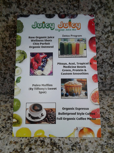 I love to visit Juicy Juicy and try different items on their very generous menu! Although I must admit that my absolute favorite is the ACAI Bowl. Everyone there is smart, vital and friendly. Karen, the owner is a delight and never ceases to amaze me with her depth of knowledge about health and her unending endeavor to get everyone healthy that crosses her path. Family members work at Juicy Juicy too and have come up with some very interesting recipes guaranteed to please any palate from adults to very young children. Everyone leaves Juicy Juicy with a smile!