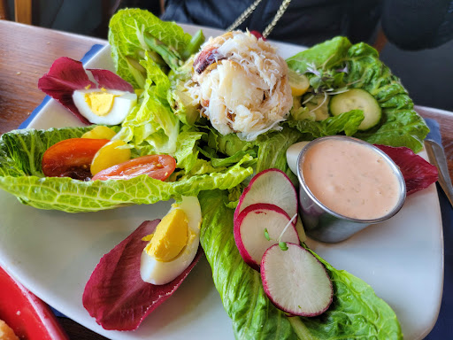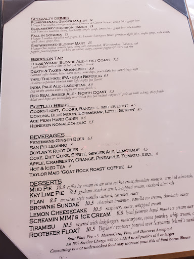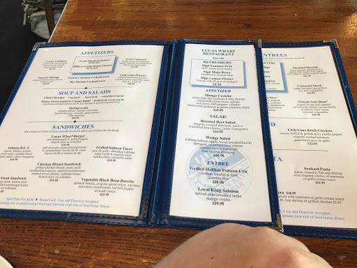 Food was good, hot, reasonably priced. Staff was courteous. Excellent beet salad. Generous bowl of Fisherman stew was heavy on the fish and wished there would have been a couple more muscles and scallops. The tomato/marinara based broth was not overly spicy. The Rock fish had a light fennel crust and was perfectly cooked. It came with way too much delicious creamy polenta and perfectly cooked seasonal veggies. Complimentary sourdough bread had good flavor but was pretty chewy/tough. Might have been better served warm or offer an alternative bread. I didnt see or hear any unhappy customers and I would highly recommend Lucas Wharf.