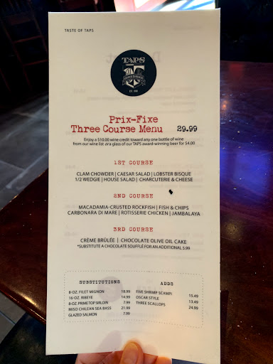 I took my wife to Taps for the first time to celebrate our 19th anniversary. We didnt know what to expect. The dining experience turned out to be an amazing experience thanks to our server named Kari. My wife ordered the miso sea bass. The presentation of the dish was extraordinary. The taste was even better! I ordered the Wharf Cioppino, and it was an amazing dish, so many flavors! Even the bread that is served at the beginning of your dining experience is one of the best that we have tasted. We highly recommend this restaurant.