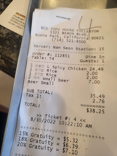This is a good location of the BCD chain. Good tofu soup, good side dishes, and pretty decent LA galbi too. Ive never felt rushed here as a previous reviewer mentioned, but thats possibly a time of day thing I suppose. In fact Id say the service is well above average for a Korean restaurant.