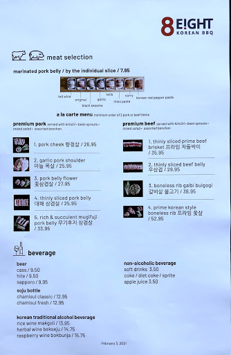 Like restaurant name, you can try eight flavors of Pork belly such as wine, original, ginseng,garlic, Herb, curry, bean paste, red pepper paste. If you eat those pork belly with kimchi, bean sprouts, mushroom and seafood soup, it will taste good. 8 flavors are in one set at $49.99 and if you order One more flavor, you need to add $6.50. Pork belly quality is really good and the soup has a hearty flavor. If you need more broth, you can request to pour more broth. Also, after eating whole soup, you can ask to make fried rice with that broth. Its really delicious and this is my favorite. Weak marinated pork bellys are better such as wine, Ginseng, garlic etc.