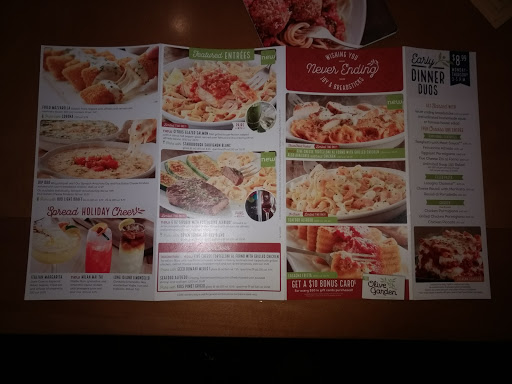 At the end of the day, you cant beat Olive Garden anywhere else for the tier in which it stands. Salads are always crisp, bread is always fresh. Menu is extensive just enough, between the entrees and appetizers something exciting always pops out at me that suddenly I feel as if I couldnt live without. If you havent yet, pop in and enjoy!