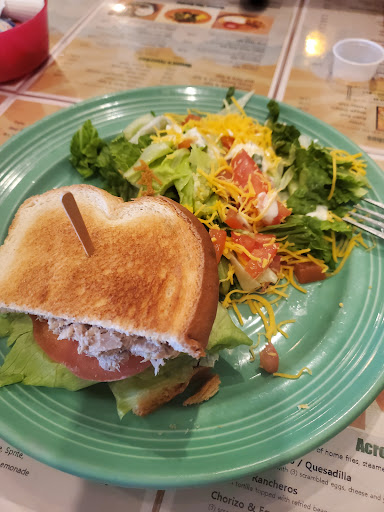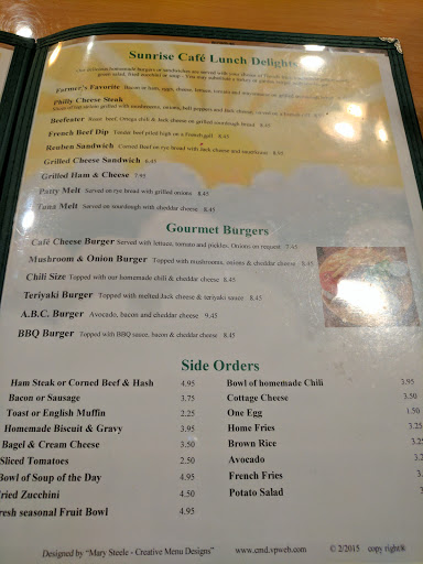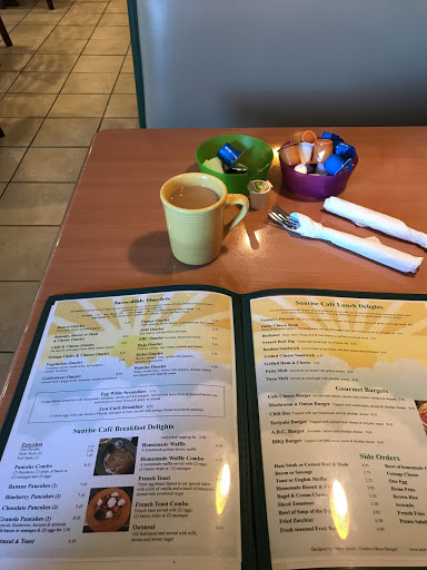 We went to Sunrise Cafe last Saturday on our way back to San Diego. This place was recommended by my cousins who are locals. Its located in the corner of a small stripmall. Not hard to find. Plenty of parkings available. Quite colorful inside. Seems lots of customers are local. It was lunch time for us so I order Philly Cheese Steak and Clam Chowder. My husband order the BLT and French fries. The servings are huge! On colorful plates ... my plate yellow, my husbands plate green. The food are quite good. Not too greasy. I liked the clam chowder! Plenty of big clams inside! I had to boxed half of my sandwich to go. Normally my husband will eat what i cant finish. Not this time. His lunch filled him up, he just couldnt help me out! My only regret is that I forgot cell phone so couldnt take any pictures. Well, I guess we just have to come back and try breakfast next time! The price is decent, good food, cheerful waitresses AND plenty of parking. What more can one ask!