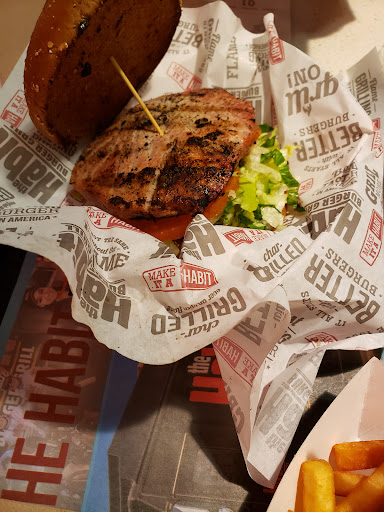 The salad was great , the chicken sandwich was pretty good , the burger was O.K. Ive had better. the pattie is a thicker processed one , has a good flavor like burger King does . The food is good but I dont see the HYPE about the habit sorry.