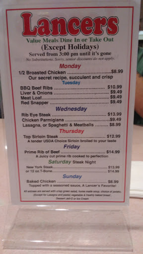 Lancers is a family restaurant. The food is good and some waiters are nice. The price is right for your money. They have a regular menu but they also have an every day menu that my hobby likes.