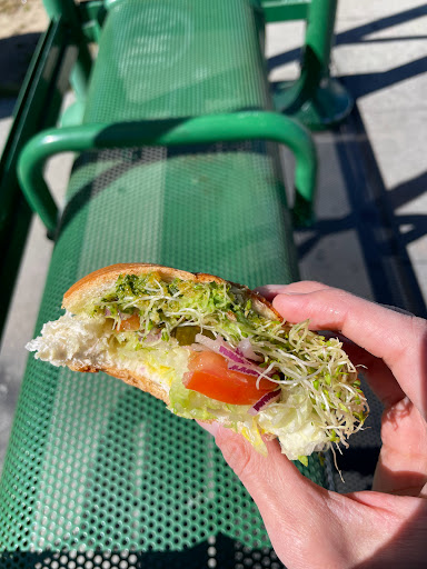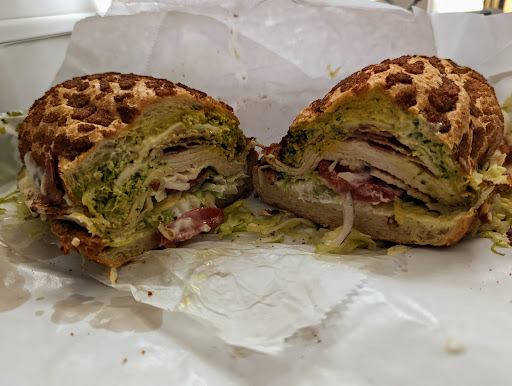 That is one big ass sandwich. Totally worth it, good ingredients, fantastic bread. The garlic spread is a little too much like pesto for my tastes, but thats easy enough to omit if you wish.