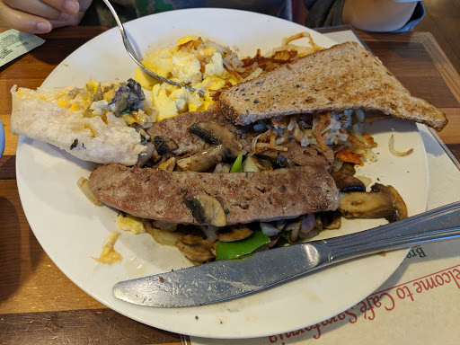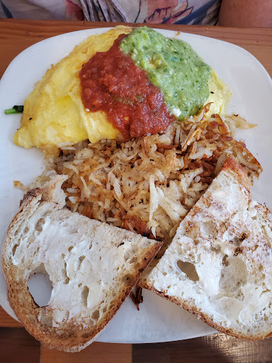 Worst. Breakfast. Ever. Coffee was old and burnt tasting. Ordered the Palisades omelette (green chilies, mushroom, jack cheese, avocado) with a biscuit and gravy. Gravy was like ham fat and drippings mixed with water and flour. Disgusting. The omelette would have been OK if they had diced or chopped the green chilies but they were whole slabs folded over so when the eggs were cooked and cheese melted around the chilies, it was still ice cold inside the folds of the chili which made the whole omelete cold. Hash browns had a powdery coat to them like flour. I ate the biscuit with some jam that set out on the table and looked like a gummy wad. So disappointed as it looked popular and homey.
