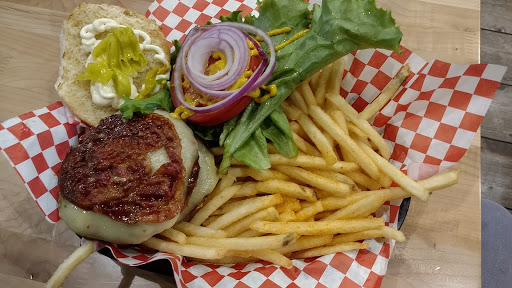 clean place build you own topping on charbroiled burger. beer battered onion rings skinny fries (lots) music just right not too loud TV sports