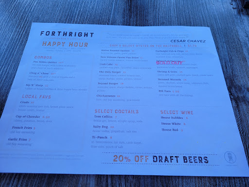 Terrific, creative seafood. Nice selection of raw and roasted oysters. Ahi collar was fantastic. Never disappointed at Forthright!