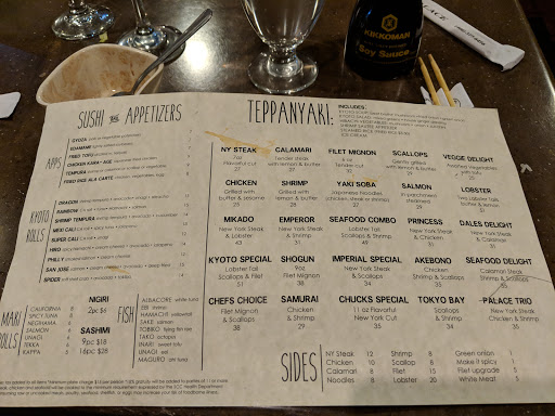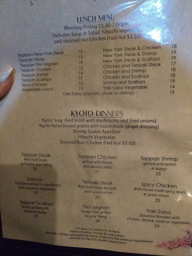 I worked at Kyoto Palace like 5 years ago. I worked at Benihana as well. I quit because I was burned out on the whole cooking thing. Kyoto Palace is a great place to eat and get a show to boot. I really miss their sushi too! Michael.