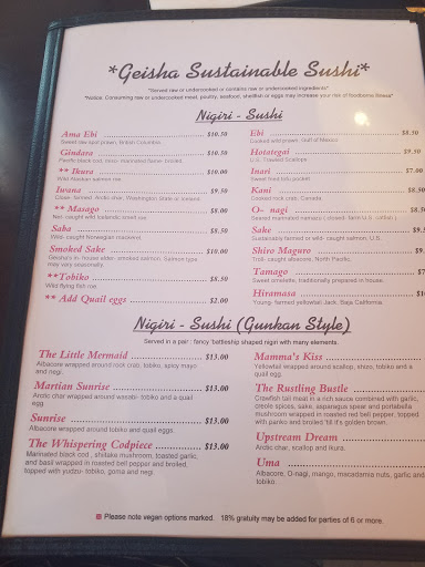 Always have heard great things about Geisha and was excited to try it, especially since they pride themselves on sustainability. When we arrived restaurant appeared very dirty, no music on, not very busy--not sure how this is ever described as romantic. Waited by front door for about ten minutes without being acknowledged, not even by sushi chefs. Watched sushi chef handling and plating fish--looked terrible! So we left without sitting down.