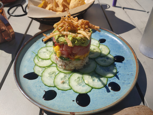 Four plus stars seems about right. Walk right across to the beach. Two things I noticed rights away;The service is great, and the customers are happy and having a good time. Our waitress knew the menu and made two solid suggestions.Everything cam out of the kitchen hot, and although we stuck to burgers and fish tacos, they were solid. Expect to meet some new friends and have a little sand in your shoes when you are done