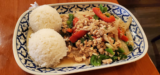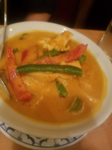 We love this restaurant. Its a small place, tucked in a corner at a strip mall, but dont let that turn you away. It has friendly service and delightful food. They have a large menu, but we love their curry dishes the best. If memory serves me, they have a red, a yellow and a green curry dish. All dishes can be made with tofu, so your veggie friends can eat there also. Theres a dish with coconut milk, basil & curry thats excellent. Oh, and their seafood is wonderful too. We have eaten there several times and love the place.