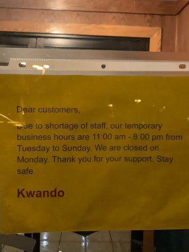 I left my school papers there.. I called an hr later, & they claimed they didnt find it.. i was reading it it there And I didnt go anywhere else after there. I go at kwando at least once a week when I eat out. Most like the waiter/waitress found it , they didnt not understand what it is & just throw it in a trash... I though kwando have at least have the Courtesy that if the customer left some kind of papers, they understand it or not, keep it for at least a week for their loyal customer instead of just throwing it away ...I was willing to ignored that fact that the cashier was so ignorant about the value of customer service, not saying ho when we walk-in and ignored me completely when i say table for two.. Most of the waitress/ waiter don not speak even the basic of English.. ( beside tea, water, or whatever your drink maybe ) food are great. But as far as Customer service goes.. I give them - 9