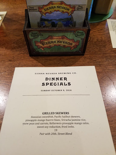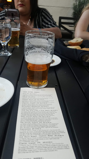 The craft beer! Oh, the craft beer! Working on the road, as I often do, and being a lover of delicious craft beer, the Sierra Nevada Taproom and Restaurant pulls me in like a thirsty moth to a lit up beer light. The Taproom/Restaurant is on the grounds of the brewery mere minutes off of CA 99. Theres plenty of parking and the tantalizing aromas of beer brewing in progress waft generously through the air. Twice Ive visited and twice Ive had a superior experience. My first visit was a tasters delight. Heres my tasting notes from that visit (not super detailed, just basic impressions): Kellerweis: soft, velvety beer. Unfiltered wheat. Delish. Otra Vez: wow. The grapefruit and prickly pear flavors really stand out. Lively, zesty. Damn good. Refreshing. Tangy. Old Chico Brand Crystal Wheat: filtered wheat, crisp, clean finish. Light bodied. Summerfest: just released today. Pilsner style Lager. Crisp finish. Healthy carbonation. Knightro: nitrogenated. Creamy Stout. Bigfoot: 2017: massive flavor roasted malt and major hops. Hearty and ggggrrrreeeaaattt. Black IPA: pretty lively carbonated for an IPA. Nice subtle roast finish. Audition-American Barleywine: creamy and hoppy, but not overbearing in the least. Caramel and toffee malt-induced sweetness. Sidecar Orange Pale Ale: Tasty, but nothing out of the ordinary. Rather light. Tropical Torpedo IPA: nice changeup on the Torpedo IPA. The fruitiness comes from the Hop varieties used, not from a fruit infusion. Old Chico Brand Pale Bock: damn good, really really good. Beer Camp Golden IPA: another winner. Sausage Platter: sauerkraut was crisp and tangy. Sausages were tasty and satisfying. During my second visit, I knocked back a pint of their "East Coast Style meets West Coast Style" Twin Tides Double IPA. Plenty of Hop flavor and citrus without any cloying sweetness made this an easy drinking and fine flavored Ale. I followed with a pint of their Audition Salted Caramel Scotch Ale. Lots of maltiness with a little smoke on the finish. Their Buffalo Wings ably staved off my hunger pangs. Drummies were well sized, but the wings needed to grow up some. Flavor was great throughout so I have no complaints. They offer both bar, dining room and outdoor seating. Inside is beautifully adorned while the outdoor area shines best when the sun does. Both times I had superior table service and easy friendliness at the host/hostess station upon walking through the adorned doors. The Sierra Nevada Taproom and Restaurant is a must for those who enjoy good food, delicious craft beer or both. Go by yourself or with a group, but just go!