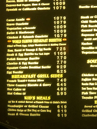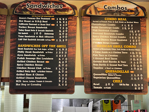 Bravos food is good quality and value. We always split a meal between 2 people. Try the breakfast burrito, chicken quesadilla, chili fries, Frisco burger or grilled chicken sammie!