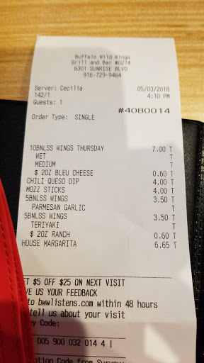My first time in this location, and theres a server named Cody, I loved his service, it reminded me of Europe, where the servers are rather relaxed, make you feel comfortable and are NOT on top of you hurrying you to pay and get out. I will definitely go back to the location in Citrus Heights and request that he serves our table again. Customers Service is super important for me, but of course the wings that he recommended were delicious!!! Awesome mozzarella sticks as well. IAnd they have tablets for children to play, so smart!
