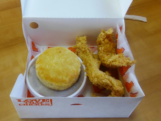 I visited at noon on Wednesday. I ordered the Wed special...3 spicy tenders, fries or mashed potatoes, (I upgraded to red beans & rice for $0.50) and a drink. The tenders were all dry and lukewarm. The red beans & rice and bisquit were good but also barely warm. This is the 2nd Popeyes location Ive been to with dry barely warm tenders. This used to be the only fried chicken place Id go to but I may have to change that.