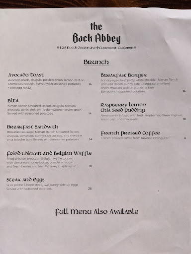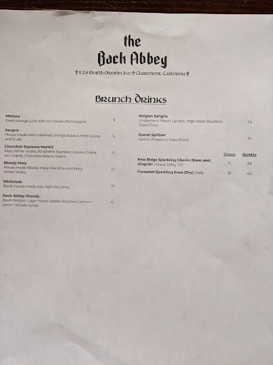 In my opinion, this is the best bar/pub food in Claremont, hands-down! I am and was a fan of Belgian style beers/ales before The Back Abbey came into existence. So you could understand my excitement when I first found out about them opening in our town. To get down to it, the food is top-notch. Everything on the menu is great! I have not had a bad plate/meal here. Any of the burgers and "The Tip" sandwich is amazing. You really have to try their fries which are cooked in duck fat. I know those that are uninitiated in things cooked in duck fat would gag, but if you are not vegetarian or vegan, you have to try them. They are the best fries on the planet!!! The selection of Belgian ales on tap and or in bottles (bottle conditioned) is second to none. They have it all. Really good atmosphere as well. Very lively. The wait-staff and service people are good and usually nice. They are usually on top of things even when the place is packed to the gills. The problem with this place is - it is too small. The size of the place adds to the atmosphere and excitement, but you will usually have to wait a long time to get a place to sit on Friday and Saturday nights. To make matters worse, there is no seating system. Yup, thats right, you have to seat yourself - or more appropriately stated (at least on Friday and Saturday nights), fight for a table or seat with all the other hungry people waiting for a seat. Most patrons are polite, forming a line along one entrance and will wait but I have experienced that some customers will just bull-rush a table and/or sneak in from the other entrance and snag a table or seat from under your nose. When you complain to the wait staff, they will continually tell you that they are not responsible for seating and/or people snagging tables/seats while you are politely waiting with others in line. But these negatives are small in comparison to the quality, taste and look of the food; the atmosphere and the great Belgian beer/ale selection that they have. My overall opinion is: This is the best bar/pub food in Claremont. There has been some recent competition opening down the street, but they do not compare to the quality and taste of the food and beer served at The Back Abbey. As you can tell, it is my favorite place to eat in Claremont.