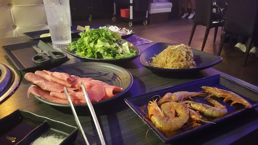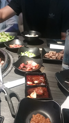 The interior is really design nicely. The lights and colors look cool. The tables come in different sizes to seat couples or larger groups. We seated seven people and were all comfortable in a booth. The tables are big and have a gas BBQ in the center where you cook your own food. The meats were pretty good and were teamed with bowls of rice. The menu is all you can eat for a fixed price of less than $21. I especially liked the red wine marinated pork belly, and we all ate to the point of being stuffed. Dont order more than you can eat of there will be an extra charge for wasted food. Service was good, but they forgot one of our orders and we waited until our server came along to correct the missing order. Our food came quickly after he cleared that up. It was delicious and a good value, but you can get carried away and get fat here. Recommended Korean BBQ.