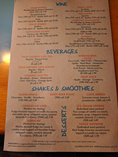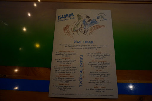 The service at this location was excellent. We stopped in for a late lunch on Sunday with my family (among them my toddler and grandmother in a wheelchair). They were great at accommodating our special seating arrangement and kept our glasses full. I was accidentally served the wrong dish and they made it right as quickly as they could and my burger was fantastic. Everything I remember Islands to be. I love the side dish options for the kids meals as well. Thank you!