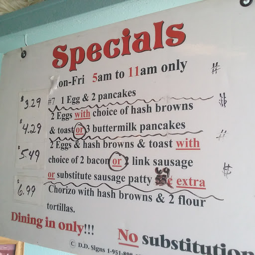 Good food, portions are a good size especially for the price. If youre planning to come during traditional breakfast hours (which is served all day) be prepared to wait. Place is always packed for breakfast. We usually come after 12 during the week and theres hardly anyone, perfect time to go. Food is always on spot. I usually get the western omelette (cheese, onion, bacon and bell peppers) which comes with pancakes or toast and hash browns for about 10$. True jewel in Corona.